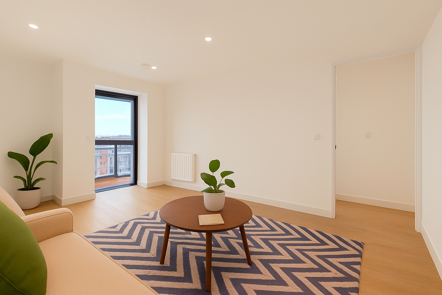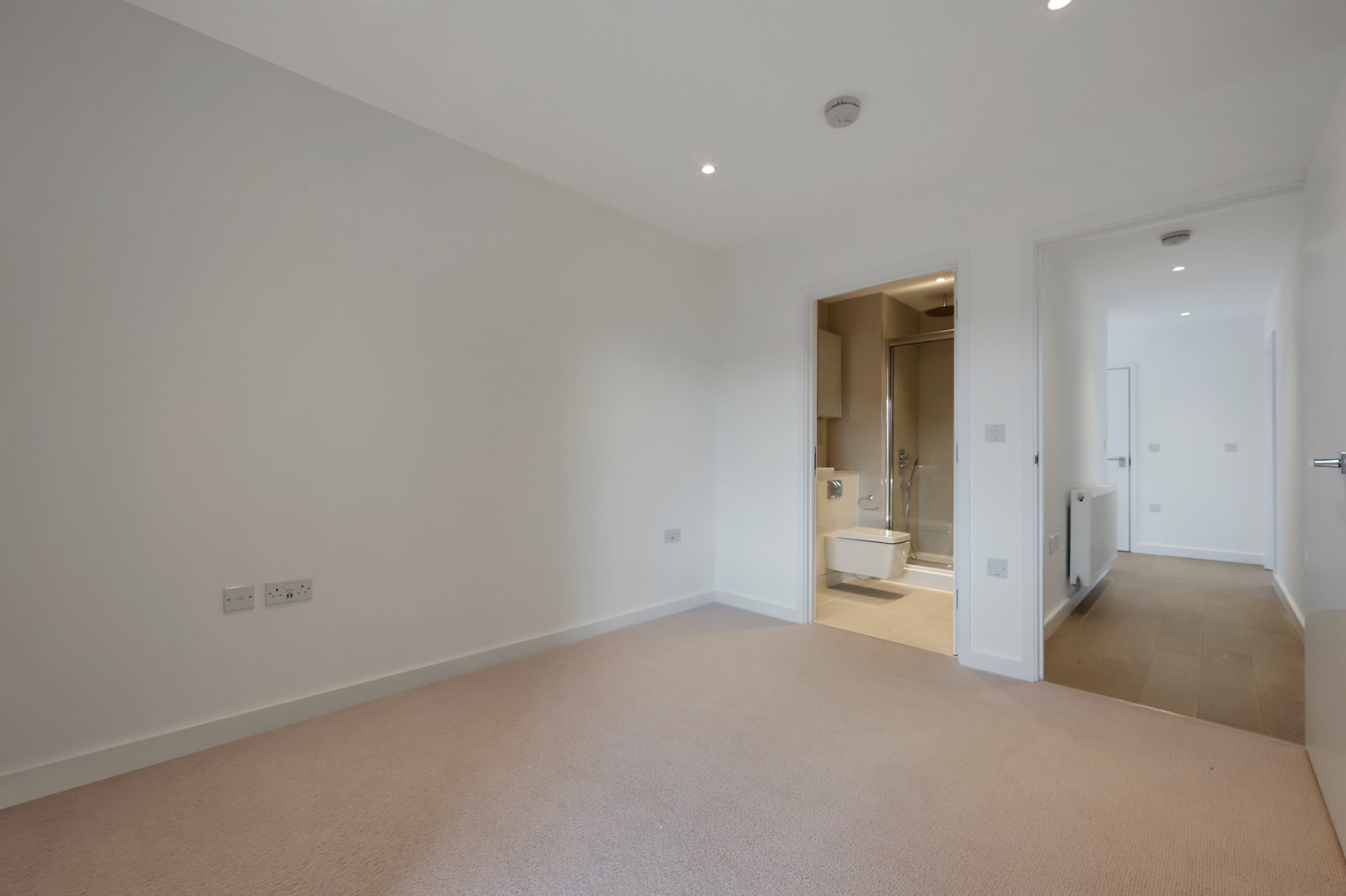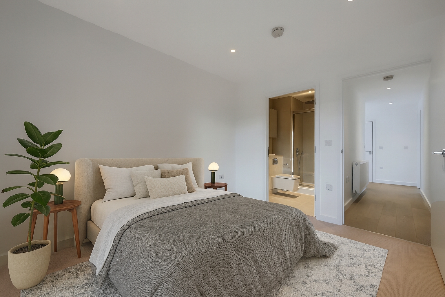 Inside, the kitchen is sleek and fully integrated, seamlessly complementing the living space, while the neutral décor, wooden flooring, and soft carpets in the bedrooms create a calm and welcoming atmosphere. Both bedrooms are generous doubles and finished to a high standard. The principal bedroom includes a modern en-suite, and a second bathroom offers added convenience for guests or sharers, making the apartment ideal for professionals, couples, or small families alike.