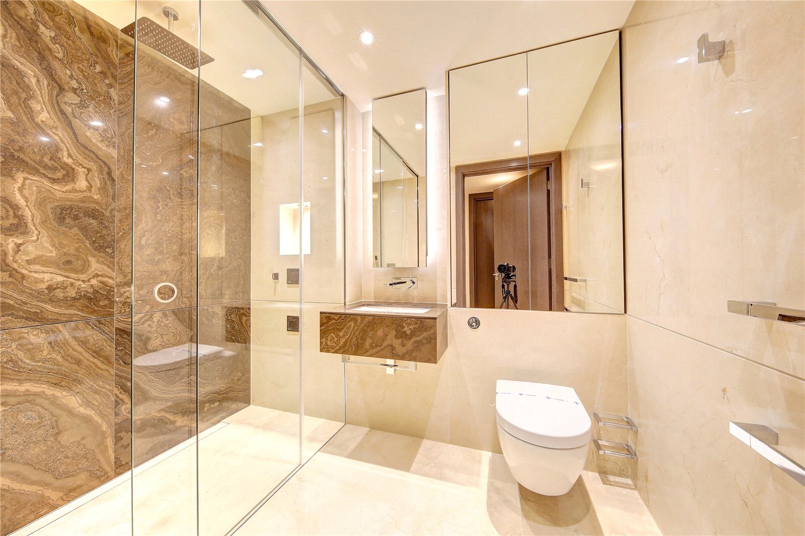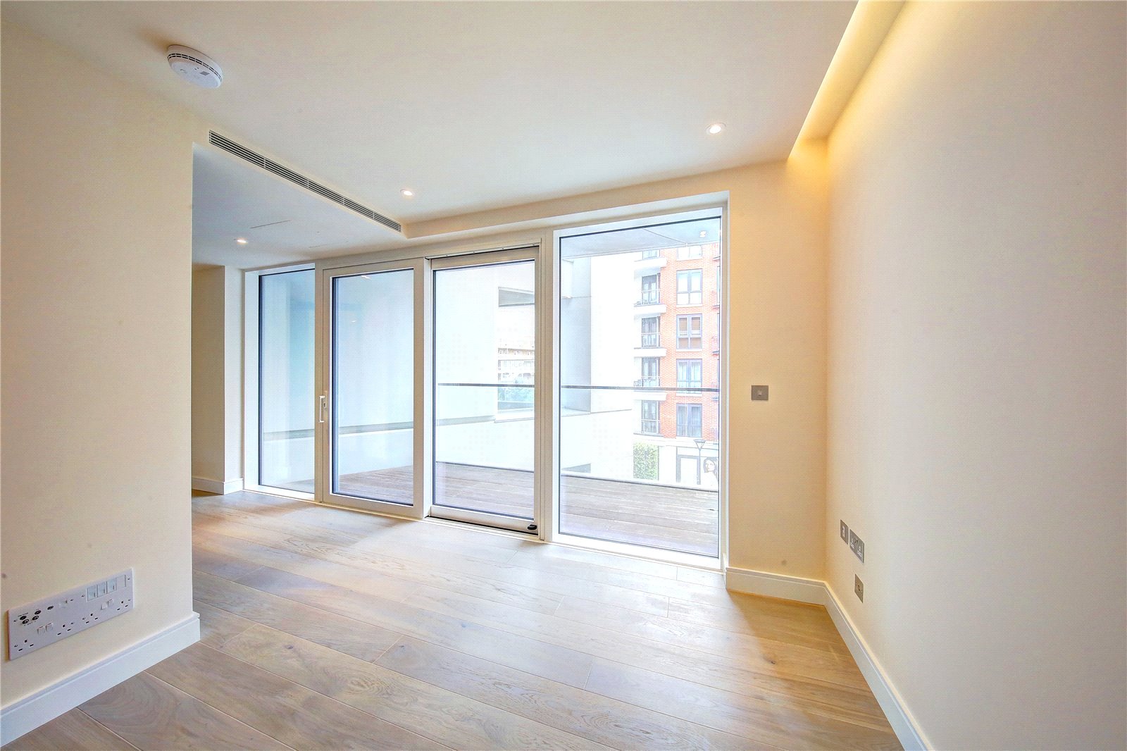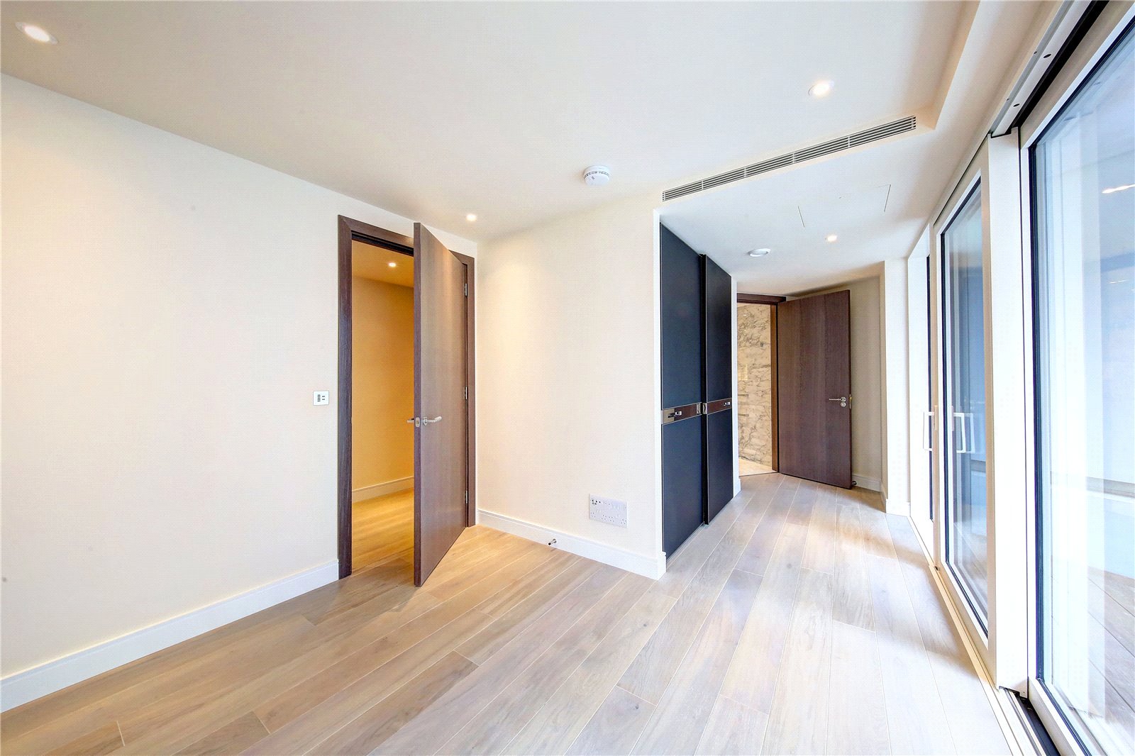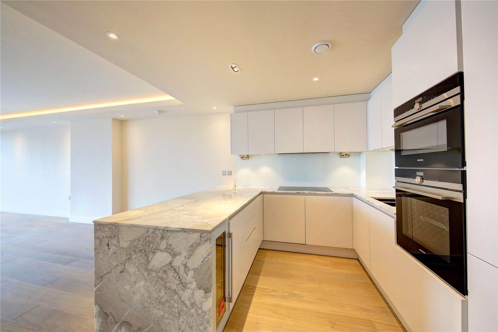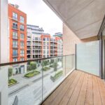 All rooms benefit from balconies thereby offering dual aspects, and there is silver oak wood flooring and air conditioning throughout. The open plan living room is spacious and bright, and the kitchen has been fitted with high quality appliances and marble countertops. Both bedrooms include built in wardrobes, and the master bedroom further benefits from an ensuite bathroom.