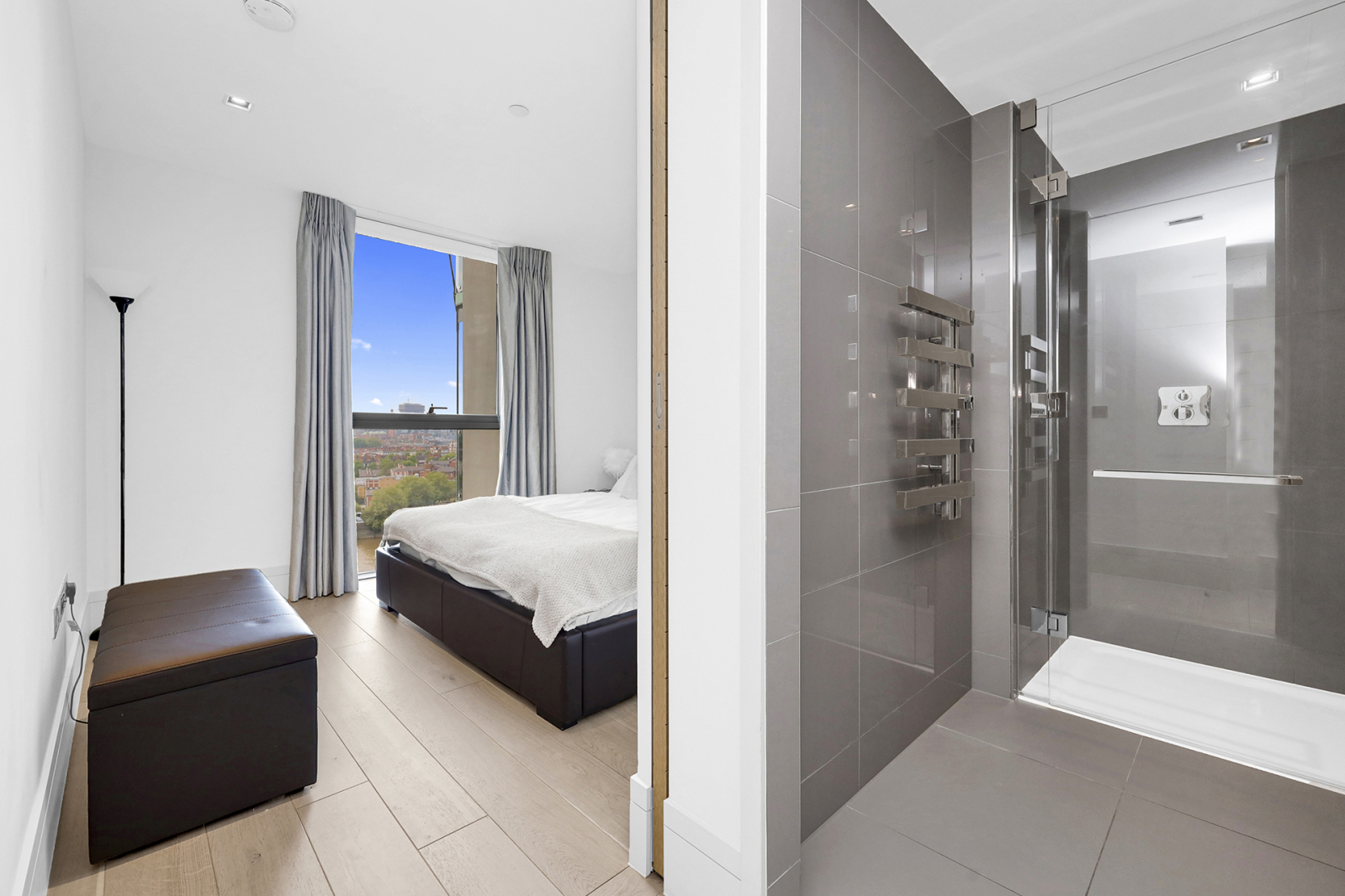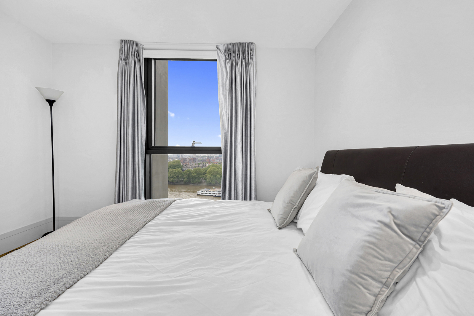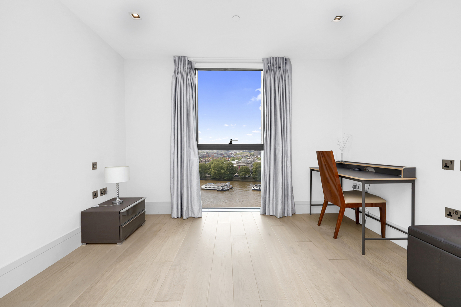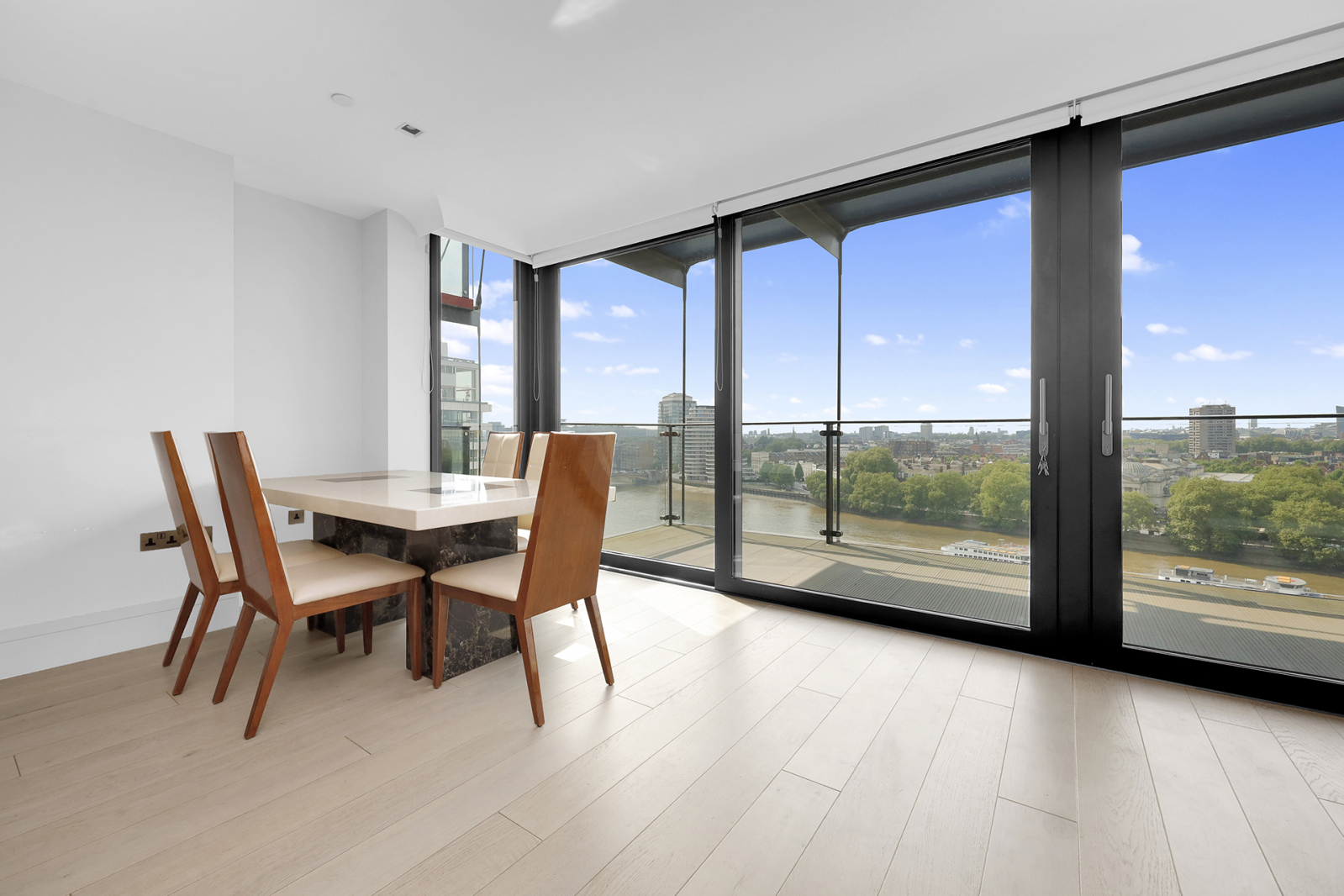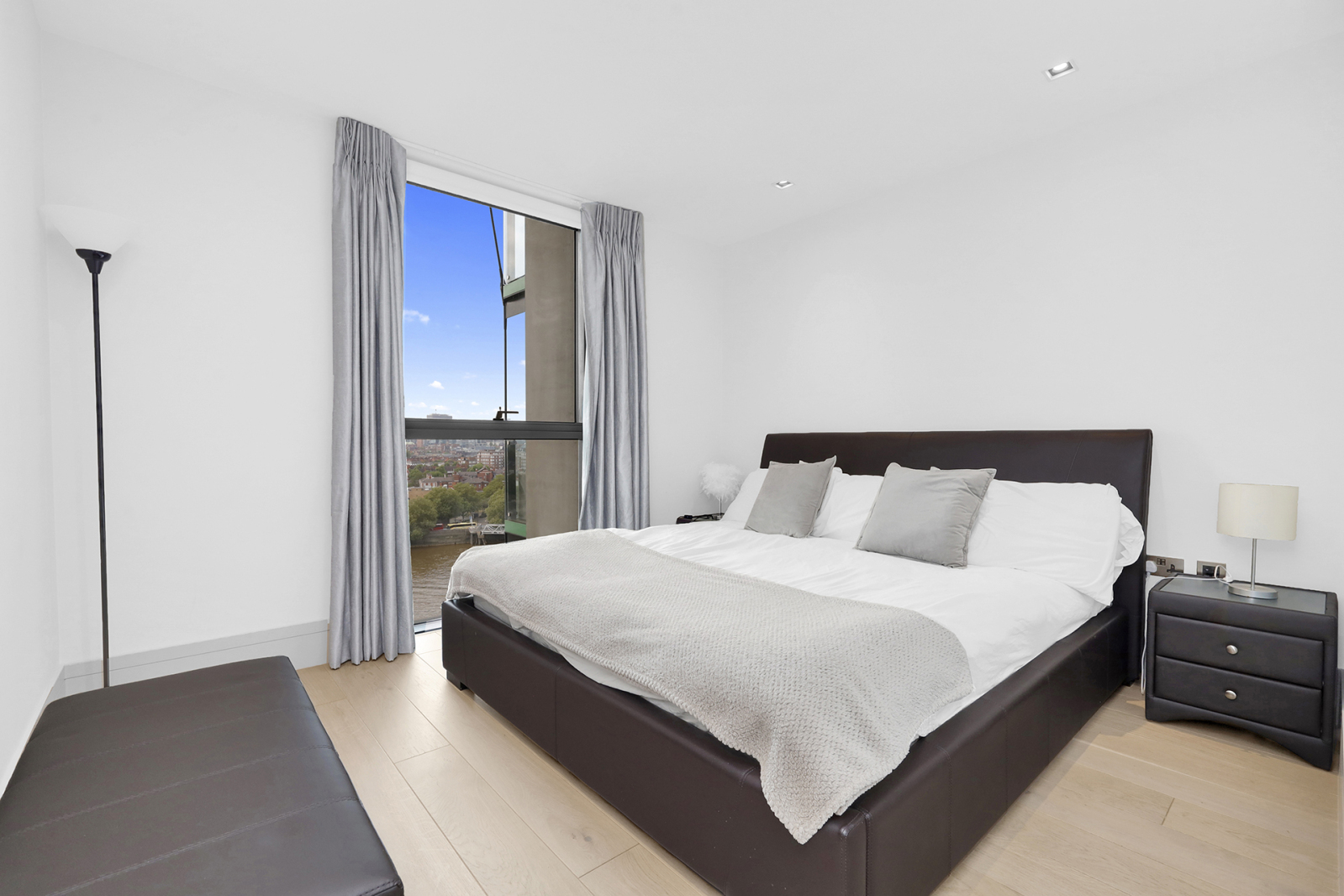 Residents enjoy exclusive access to a shared roof terrace with panoramic views, a 24-hour concierge service, and the convenience of secure, modern living in one of London’s prime riverside developments.