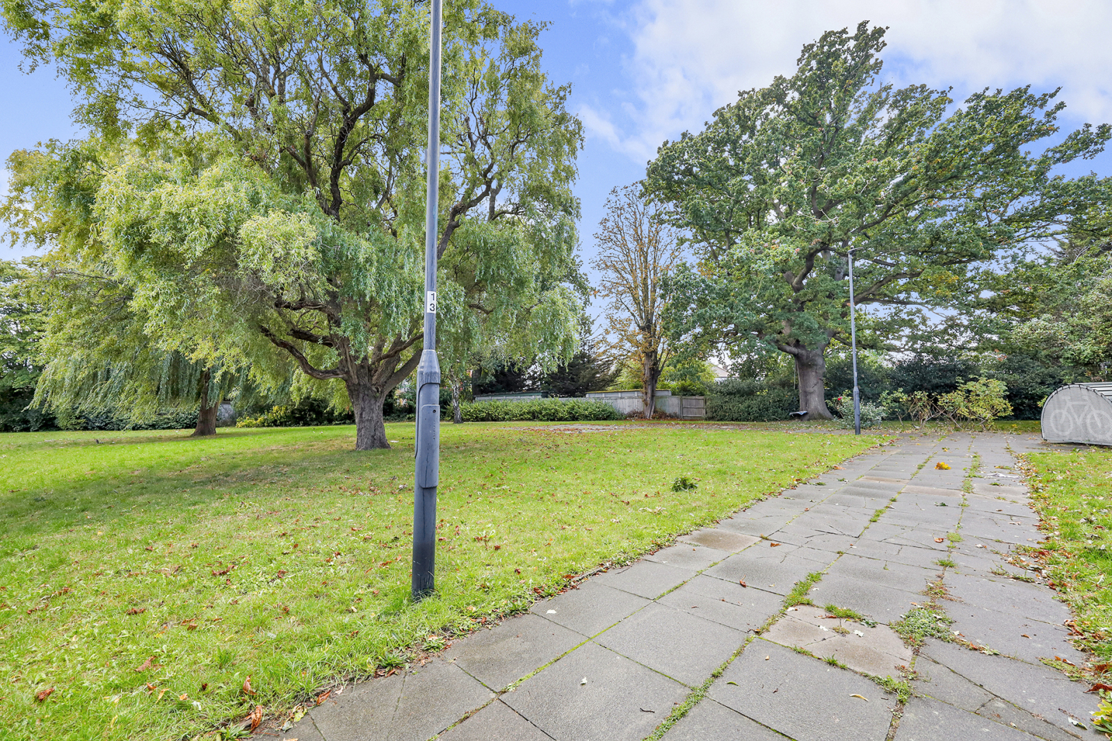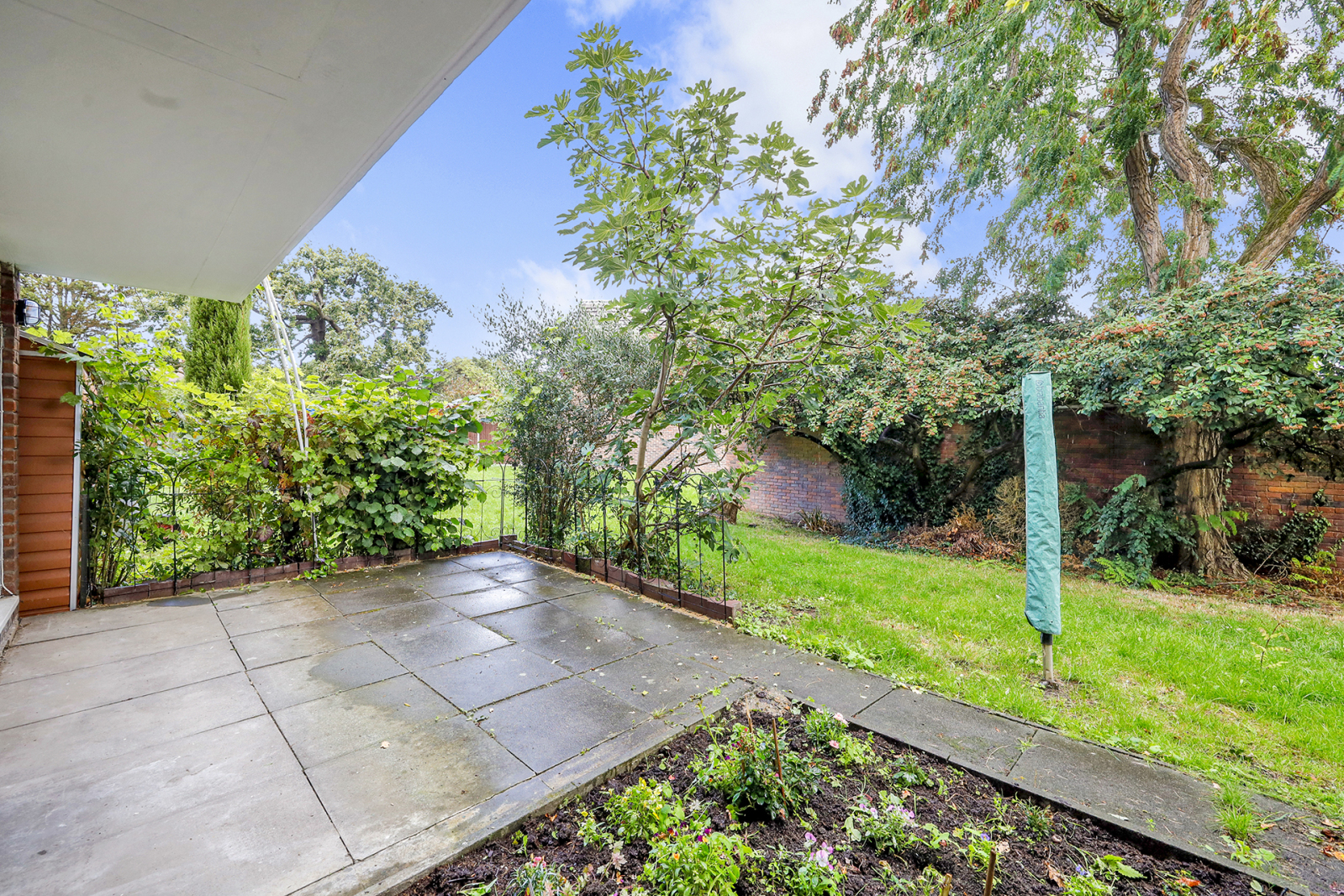 The property has its own private entrance leading into a bright and spacious living room with wooden flooring and French doors that open directly onto a private garden patio. Beyond the patio, well-kept communal gardens add a further sense of space and tranquillity.