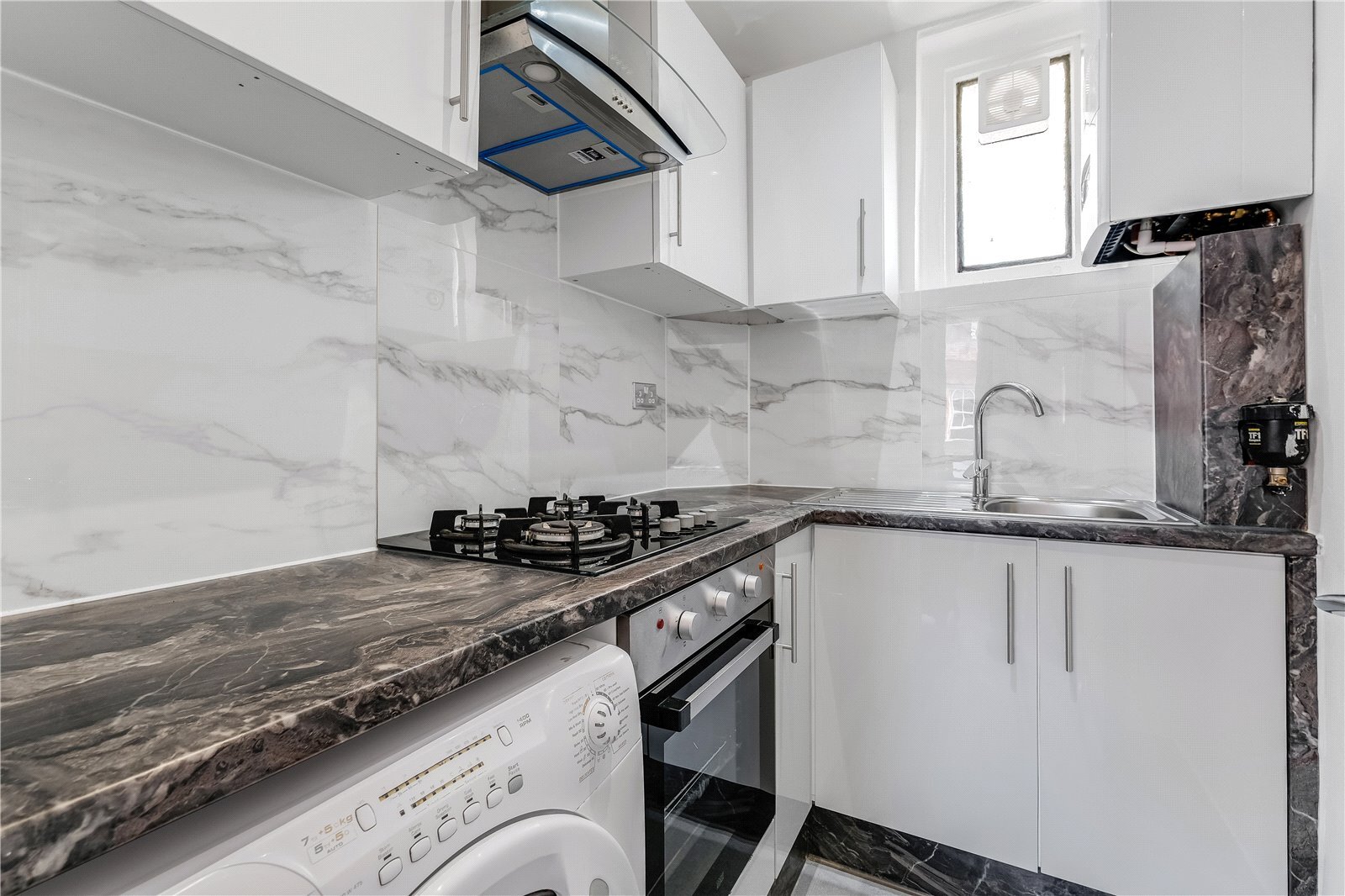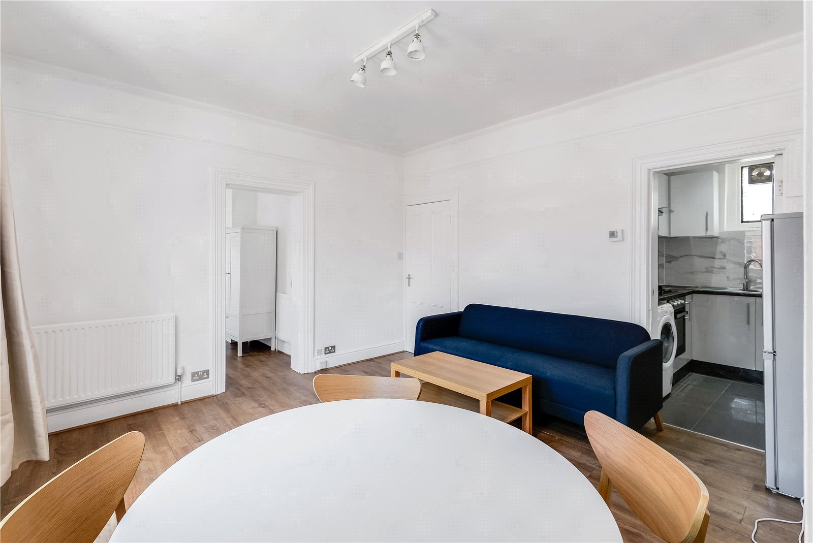 A welcoming, bright and airy living room provides an inviting space to relax, complemented by sleek wood flooring and large windows that fill the room with natural light. The separate fully-fitted kitchen is equipped with modern integrated appliances and ample storage, making it both practical and stylish.